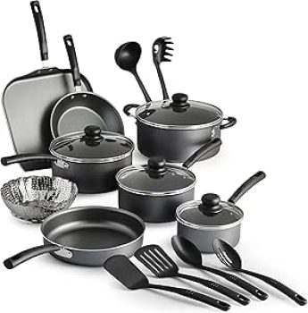 Este set incluye 18 piezas: 6 sartenes, 1 plancha cuadrada, 1 soporte vapor y 6 cucharas de color gris